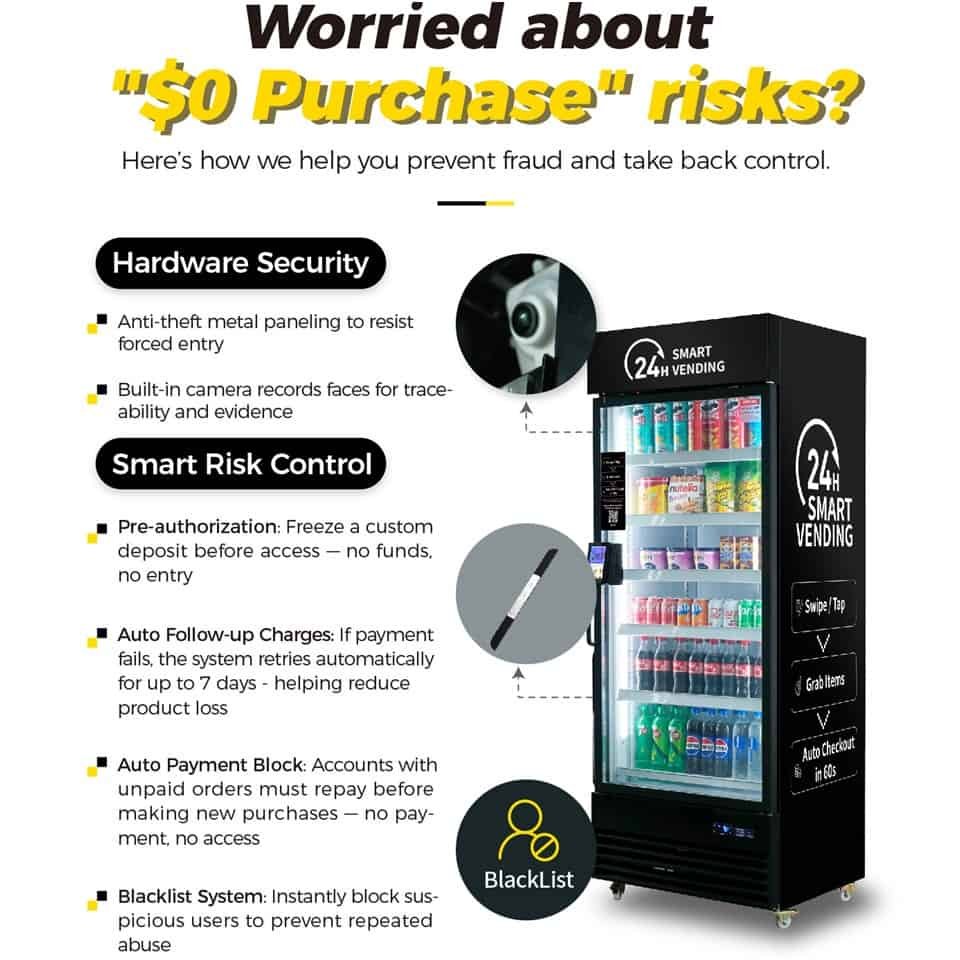 - Auto checkout in about 60 seconds. Receipt and telemetry sync to your dashboard.